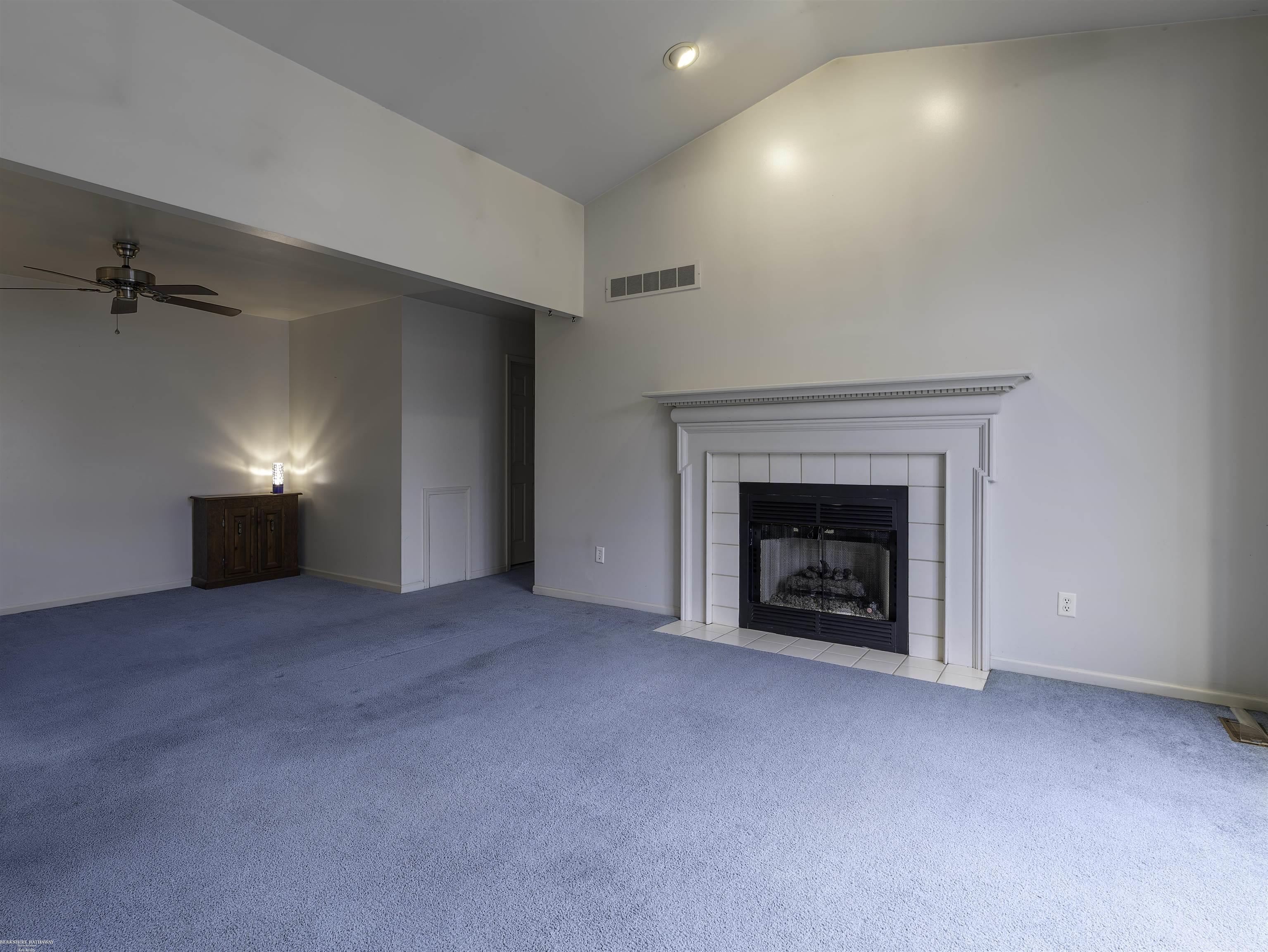This corner unit offers a light filled space with comfort and style. The Great Room has a vaulted ceiling offering an open airy feel. The gas fireplace has wood and and tile surround and a mantel with dental molding. The open living area is a great place to entertain. The kitchen is equipped with warm wood cabinetry, pantry and stainless steel appliances that include a brand new dishwasher and hood vent. Convenient 1st floor laundry comes with a washer and dryer. Both bathrooms have tile floor and tile in bath/shower areas to the ceiling. Other features include a full basement, 2 car attached garage and 2 decks. Extra parking for guests on the side of this unit. Possession at closing. 1 dog or 1 cat 40 pounds or less is allowed.