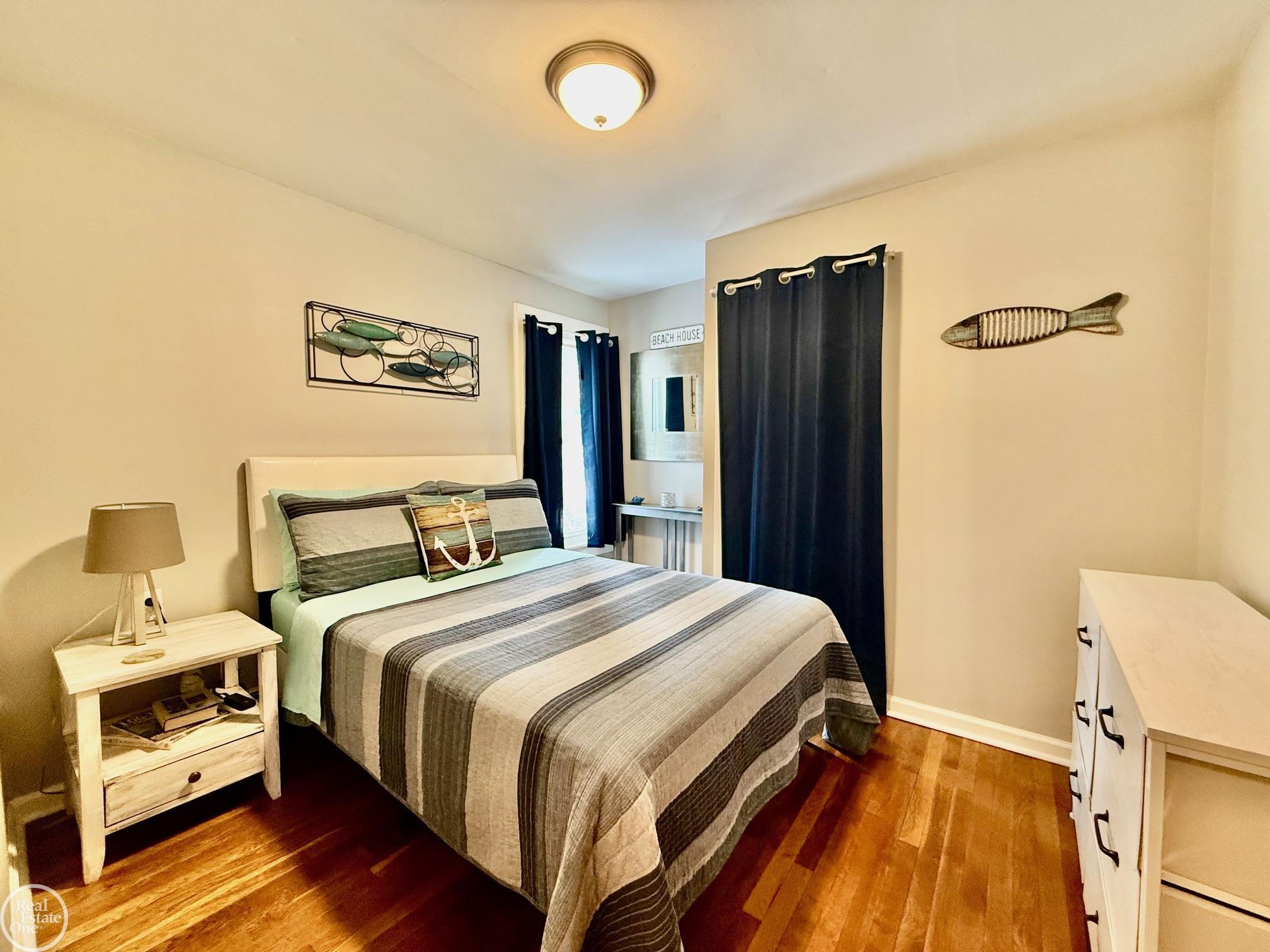 SUPER CUTE 3 bedroom ranch right in the heart of popular downtown New Baltimore, walk to everything...shopping, bars, restaurants, beach, lake, etc... tastefully decorated throughout, large open living room, formal dining area open to remodeled kitchen w/newer dark "soft-close" cabinets w/quartz countertops, stainless steel appliances (stove, fridge, microwave, dishwasher), stackable front load washer/dryer to stay, master bedroom has large walk-in closet w/plenty of storage, ceramic tiled remodeled bath, overhead paddle fans, immaculate hardwood floors, vinyl windows, 3 dimensional roof, attached 1 car garage w/enclosed "Florida room" off rear of garage w/patio, nice private fenced in backyard w/shed & firepit, shows exceptionally well, immediate occupancy,